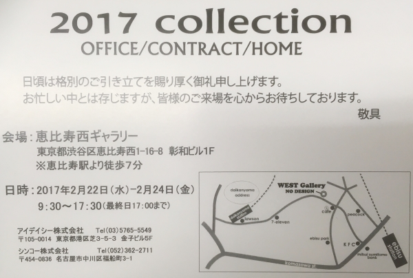 2017年も、2月22日から24日までの3日間、椅子張りとその資材の展示会を開催いたします。 オフィス、コントラクト、ホームの3種類の用途向けで準備させていただいております。 近年、それらの垣根のない使い方が増えていますので、各業界の方々の参考になるように心がけております。