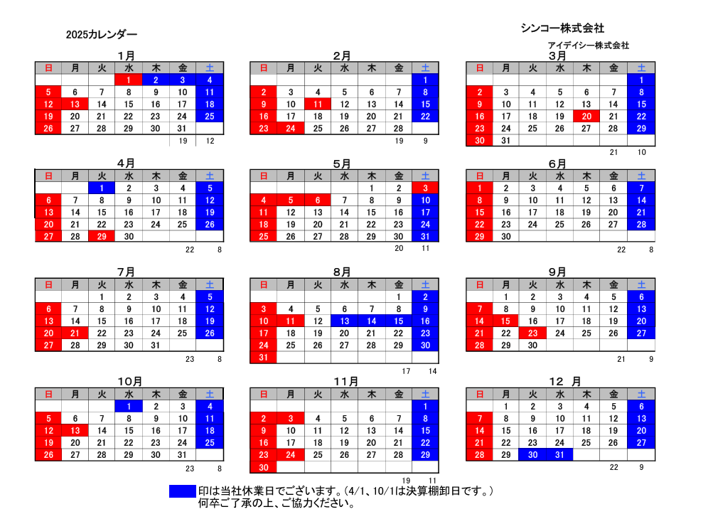 お知らせ2025年営業日のお知らせ2024.11.28 Post この記事のタイトルとURLをコピーする2025年度のお客様参照用 営業日カレンダーです ダウンロードは、以下をクリック願います。 Sincol2025カレンダーお客様用尚、大人気の大型カレンダーは、弊社営業担当へ、お申し付け頂ますよう宜しくお願いいたします。 Post 夏休暇のお知らせ前の記事 We wish you a merry christmas‼次の記事