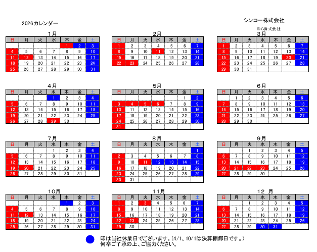 お知らせ2026年 営業日カレンダー発行しました2025.12.02 Post この記事のタイトルとURLをコピーする椅子資材のプロ、名古屋のシンコーのカレンダーです。 ダウンロードしてお使いください。 シンコーカレンダー2026 又、手帳に入るミニカレンダーがご希望の方は、担当営業までお申し付けください。 Post 師走 クリスマス 年末 在庫充実してお待ちしております。前の記事