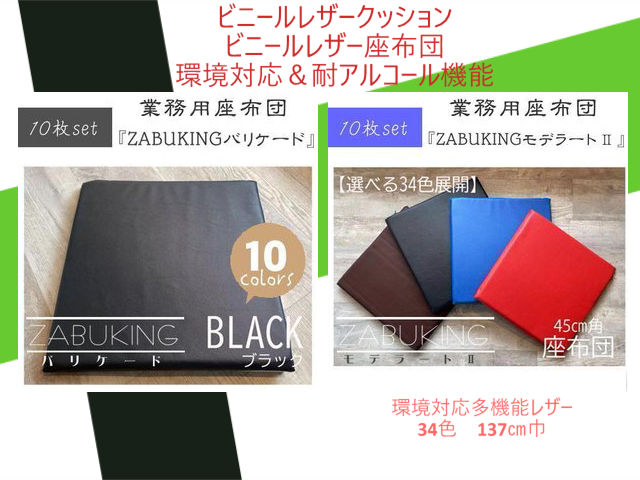 その他例:業務用家具メーカーさんからは、非常に多数のビニール座布団、ビニールクッションの案件、物件をいただき、それぞれ別注製造を承っております。 あらゆるサイズと数量のオーダーに、国産の耐アルコールレザーや耐次亜塩素酸レザーでクイックに準備できる体制は、弊社ならではの得意技です。 尚、汎用サイズ、汎用タイプにおいては、ザブキングという商品名にて、一般ユーザーさんからもネット受注もしております。 海外製の安いものでは1年しか使えませんが、国産レザーの座布団やクッションは、丈夫で長持ち、結果トータルコストも安くなりますし、長く使えるものを選択する豊かな気持ちが知らずにSDGsに貢献しています。